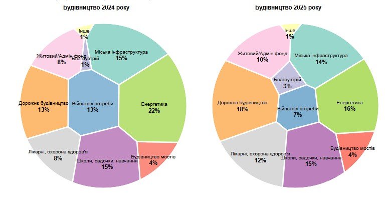 В отличие от дорожных тендеров, доля расходов на военные нужды (в основном на строительство фортификаций) за год упала с 13% до 7%, а на направление энергетики, которое предусматривает восстановление уничтоженных россиянами объектов и строительство укрытий вокруг них, – с 22% до 15%. Последние цифры имеют несколько объяснений.