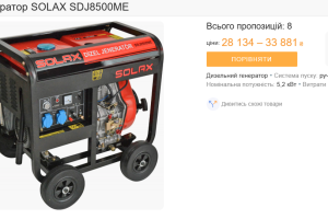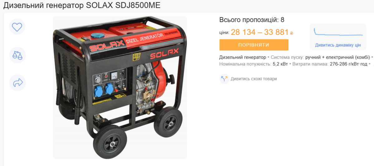 Самой популярной моделью дизельного генератора является SOLAX SDJ8500ME, мощностью 5,2 кВт. В среднем это устройство стоит 32 130 гривен и потребляет 0,3 литра дизельного топлива на 1 кВт-ч – 16,66 гривны. Это почти в четыре раза выше тарифа для населения.