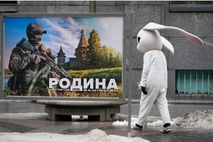 Архив: уличный артист проходит мимо рекламного щита с изображением российского военнослужащего и лозунгом "Родина, которую мы защищаем", Санкт-Петербург, 14 марта 2023 г. Copyright 2023 The Associated Press. All rights reserved