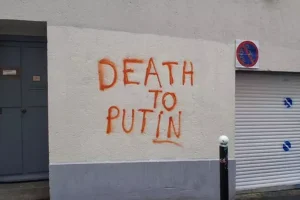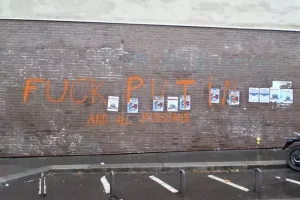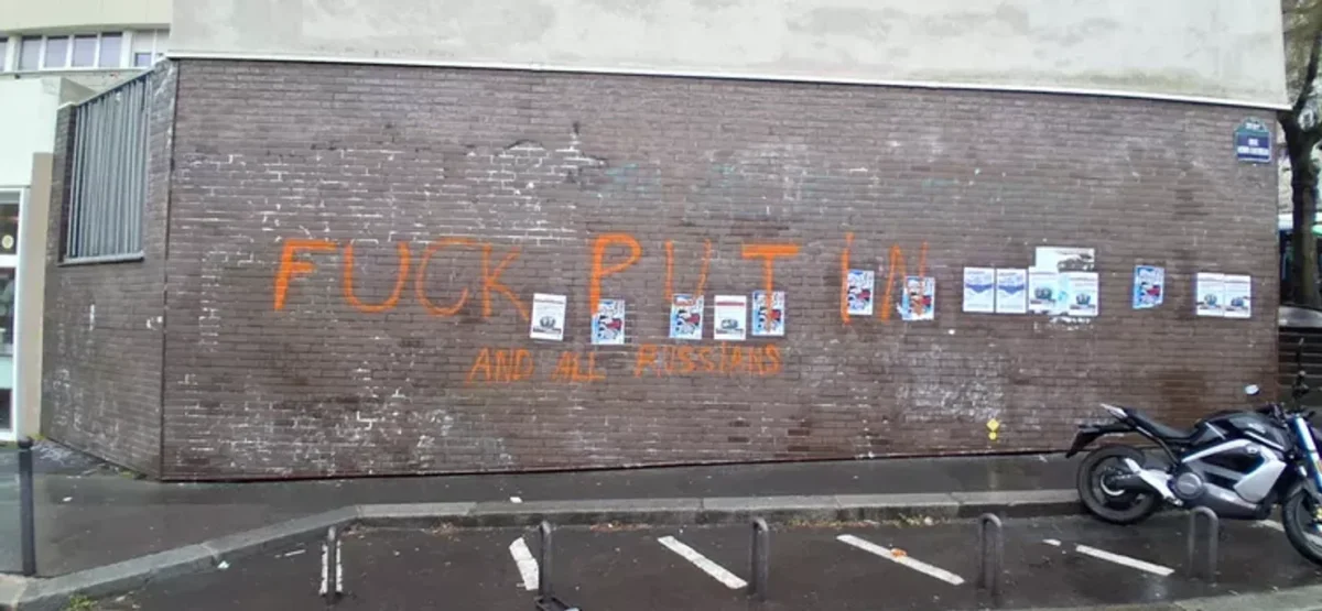 "На витринах и стенах вокруг были написаны оранжевой краской надписи, прямо касающиеся главы российского государства и России, с такими сообщениями, как Fuck Putin and all russians, Death to Putin или Poutine assassin", — говорится в материале.